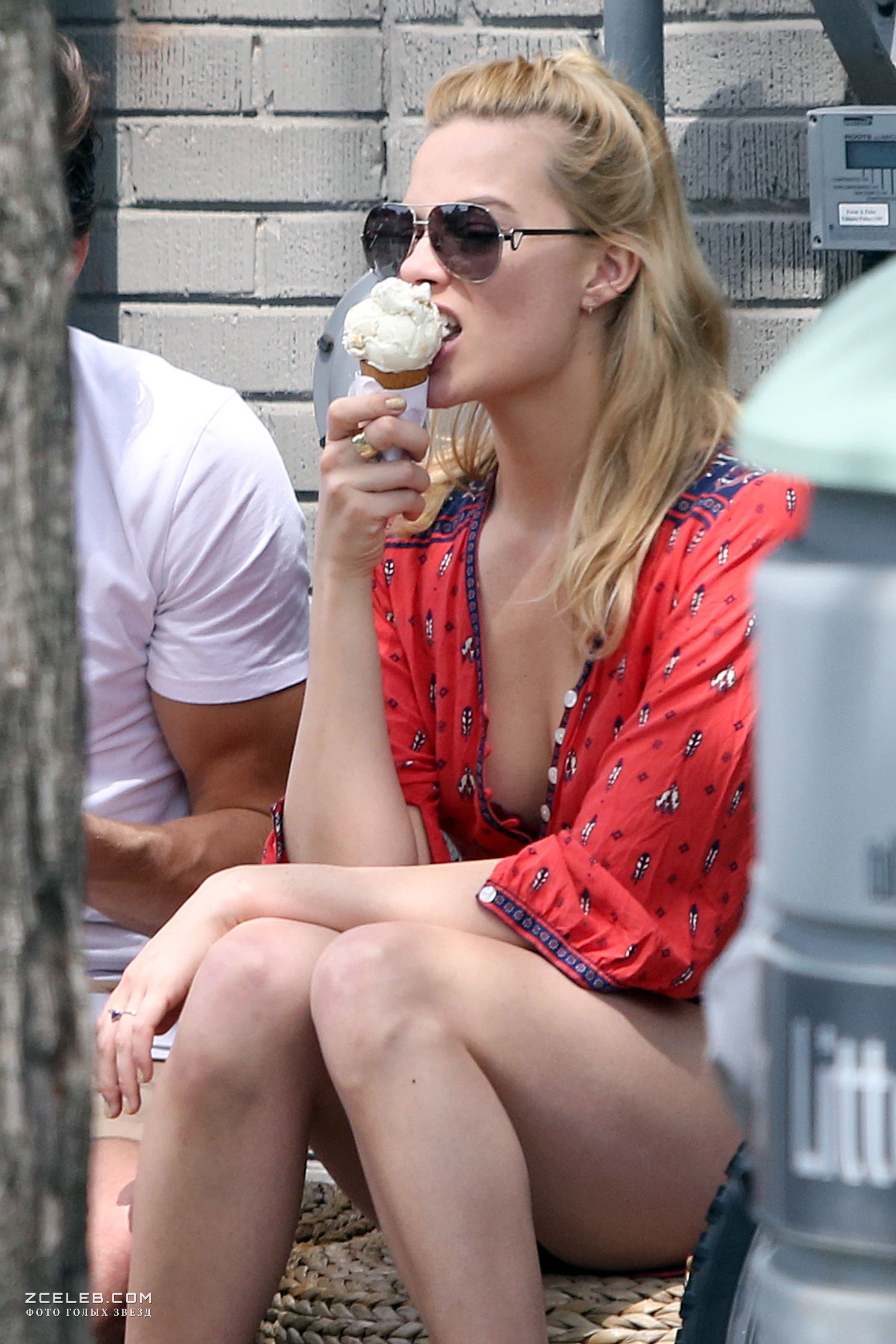 Секси Марго Робби с глубоким вырезом аппетитное ест мороженное 11 июня 2015 года в Торонто.