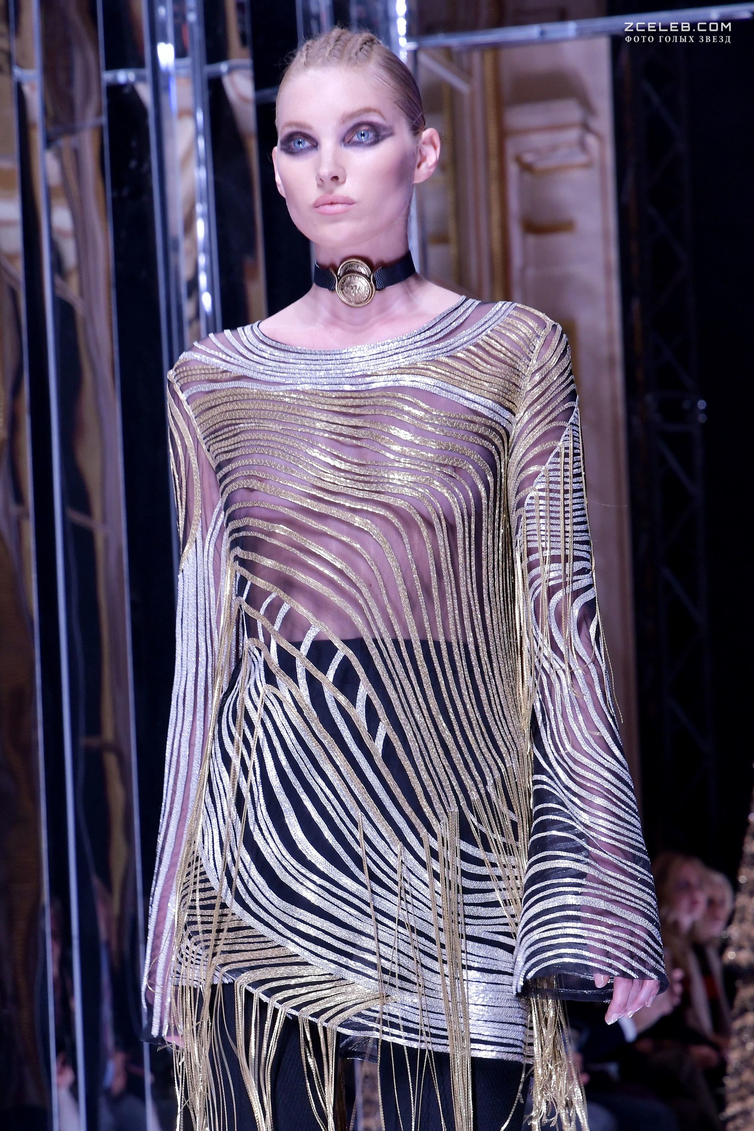Эльза Хоск без лифчика профессионально дефилирует на Paris Fashion Week 2 марта 2017 года. Модель представляет модный наряд, созданный из абсолютно прозрачной ткани. И своим примером демонстрирует, что для создания вкусного образа бюстгальтер будет лишним.
