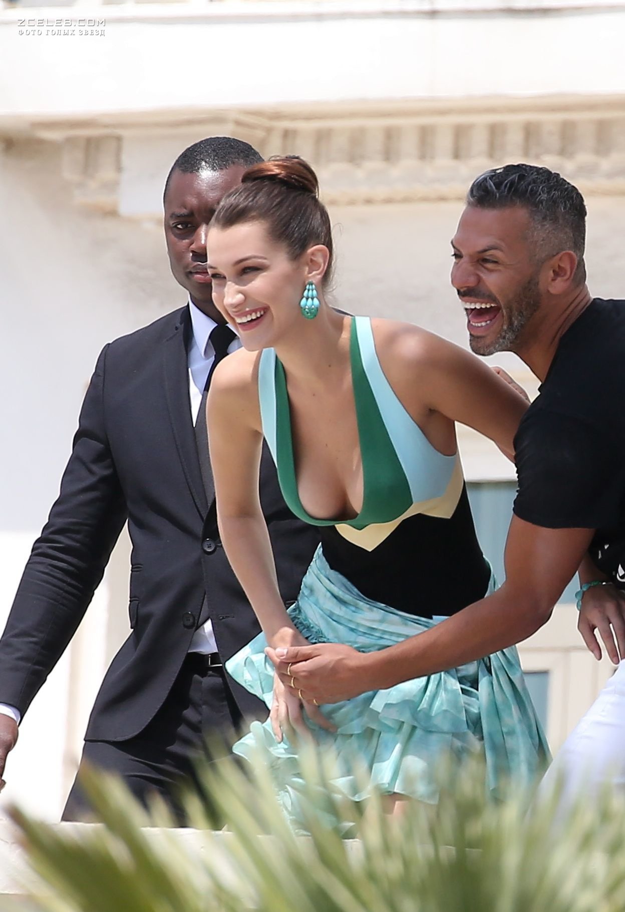 Белла Хадид так искренне улыбается во время фотосессии в отеле Мартинез в Каннах в 2016 году. Но ещё более ослепительной её делает шикарное платье с открытым декольте, открывающим её упругую грудь.