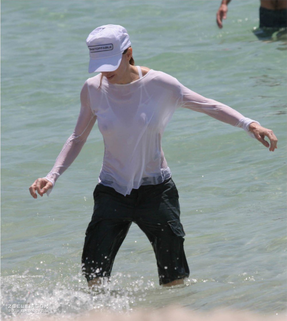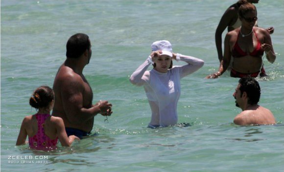 У Мадонны видно грудь сквозь мокрую одежду во время её весёлого купания на пляже. Видимо, было настолько жарко, что певица решила окунуться, не раздеваясь.