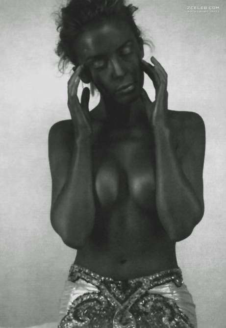 Красивая Кайли Миноуг с голой грудью снялась в оригинальном образе. С таким тёмным оттенком кожи и этнической юбкой она похожа на страстную жительницу диких джунглей или других далёких и неизведанных краёв.