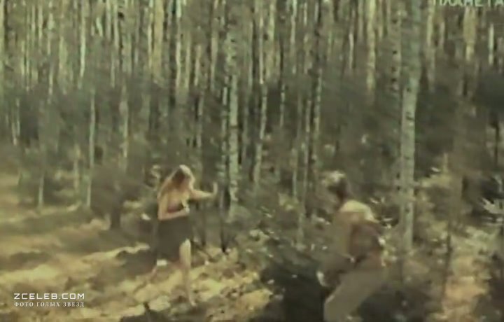 Полностью голая Ирина Алферова в фильме «Черная береза» в 1977 году. Девушка затаилась между высокими стволами, но даже там не скрылась от постороннего взгляда.