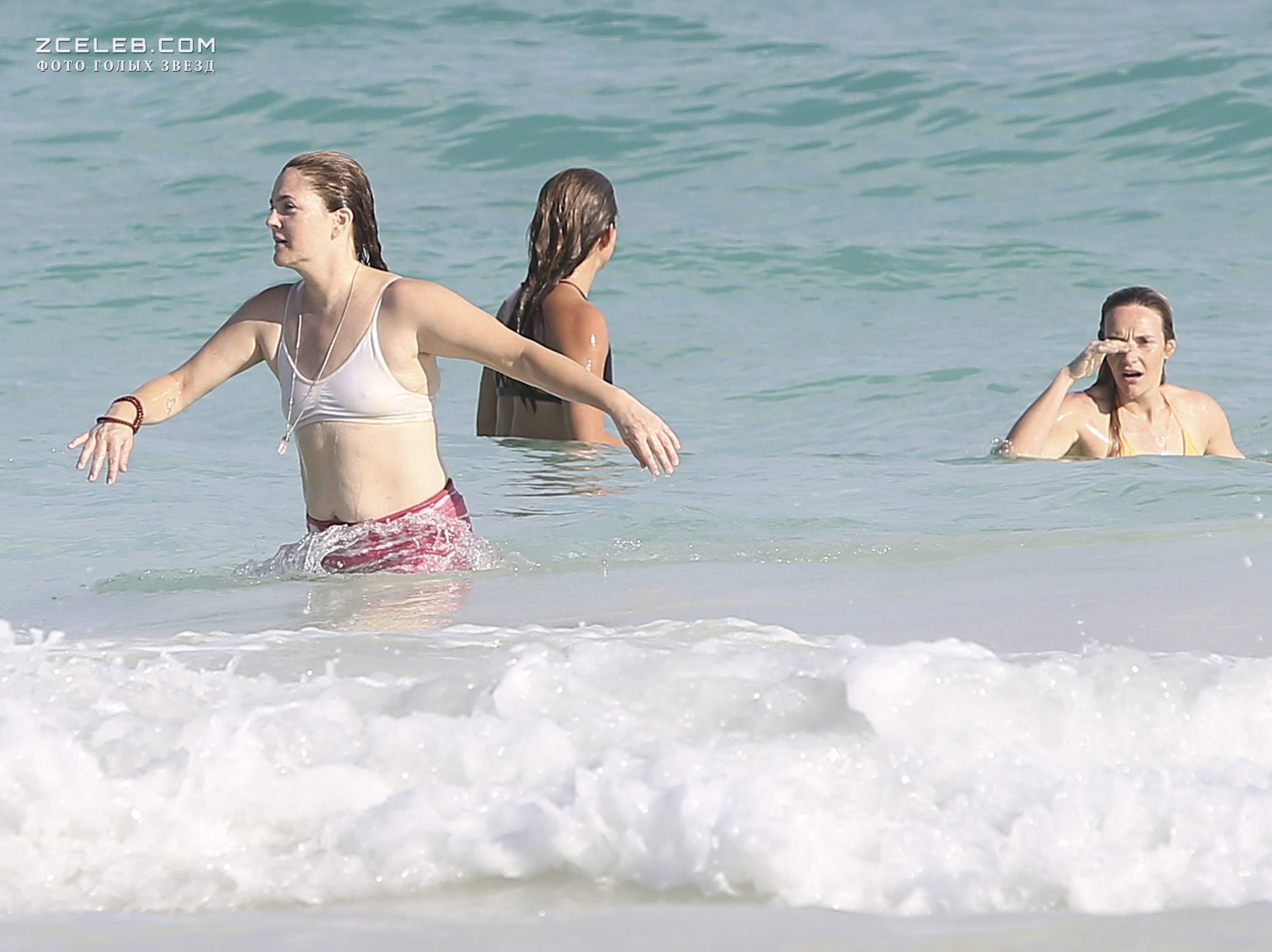 Торчащие соски Дрю Бэрримор в купальнике на пляже Майами, 12.11.2016