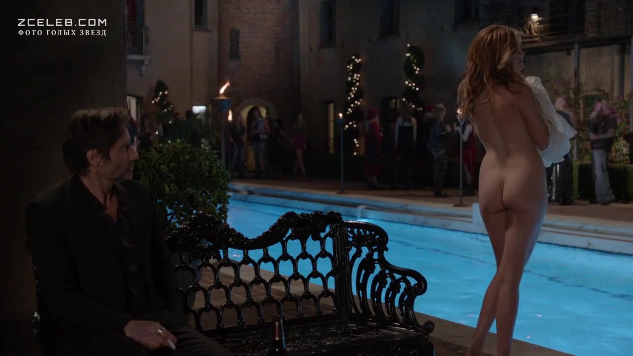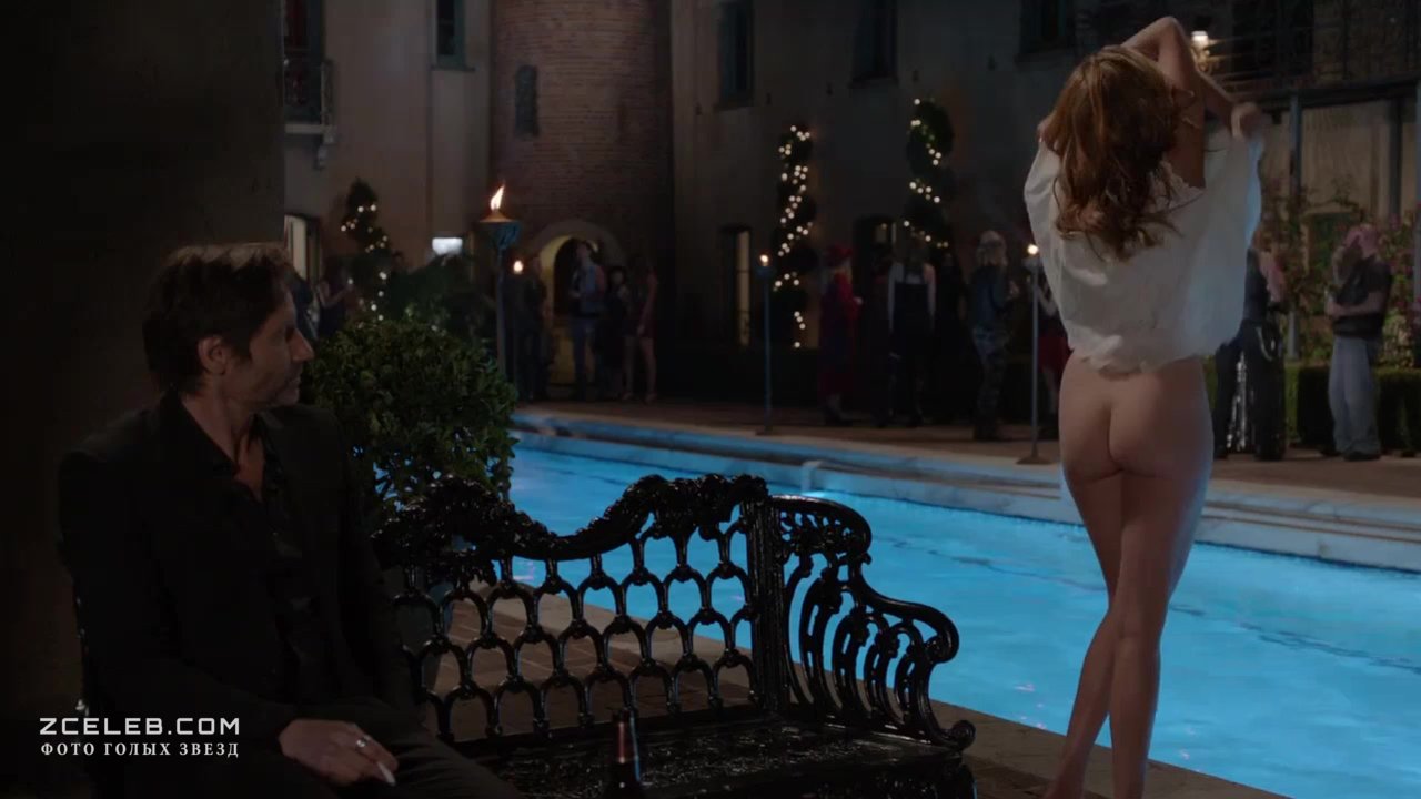 Голая попа Мэгги Грэйс в сериале «Блудливая Калифорния» в 2007 году. Если уж купаться в лазурном бассейне, то голяком. Ведь так приятней и полезней.