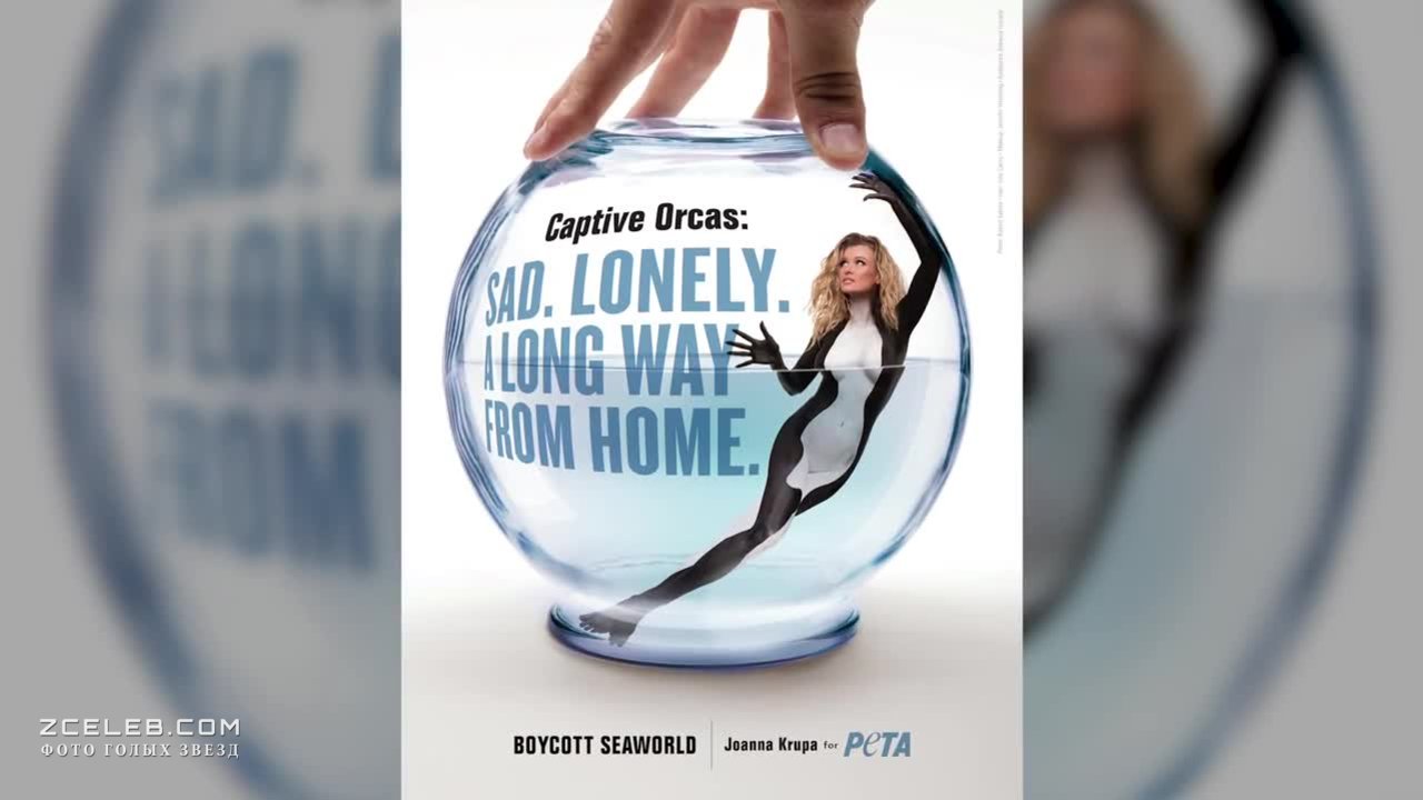Джоанна Крупа обнажилась для социального рекламного ролика, посвященного проблеме живущих в неволе обитателей морских глубин. Раскрашенная в черно-белые цвета косатки 36-летняя Крупа изображал самку этого млекопитающего. Топ-модель даже отказалась от традиционно используемых в таких случаях маленьких трусиков, и предстала перед мастерами боди-арта совершенно обнаженной.