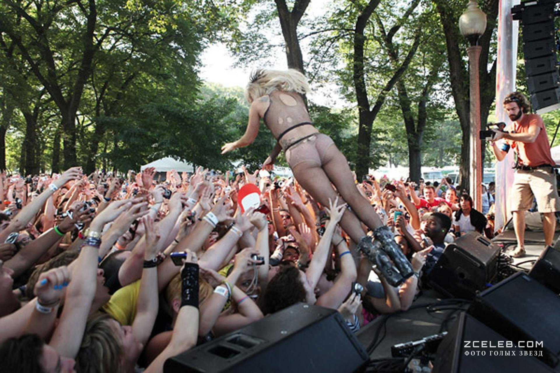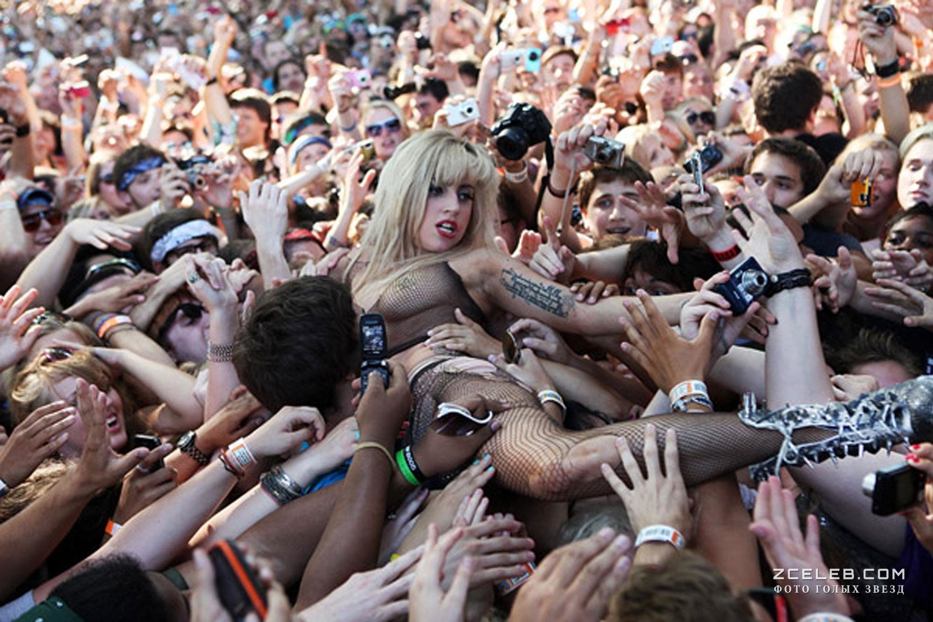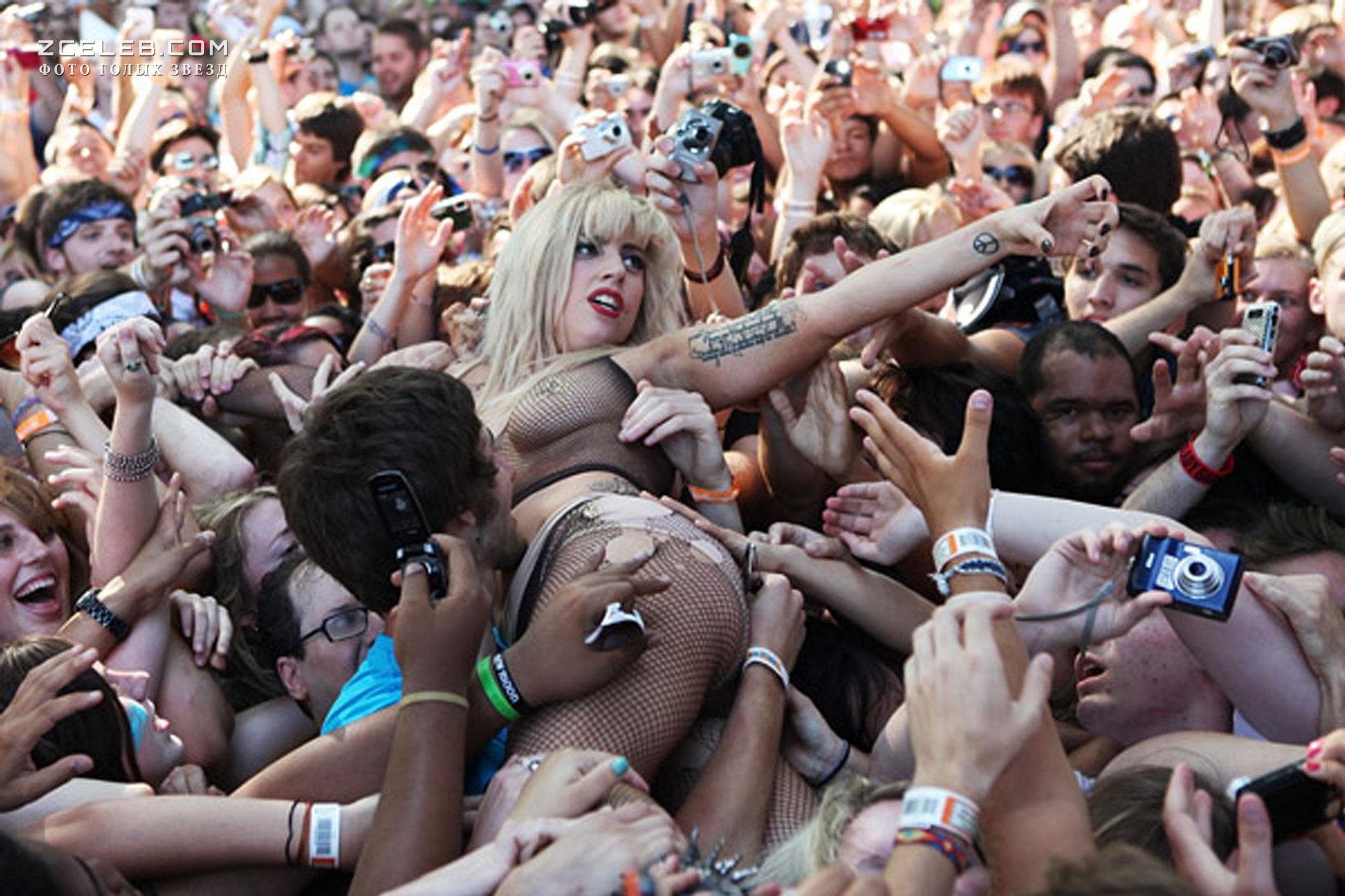 Леди Гага в развратной одежде прыгнула к фанатам со сцены на концерте Lollapalooza 2010 года.