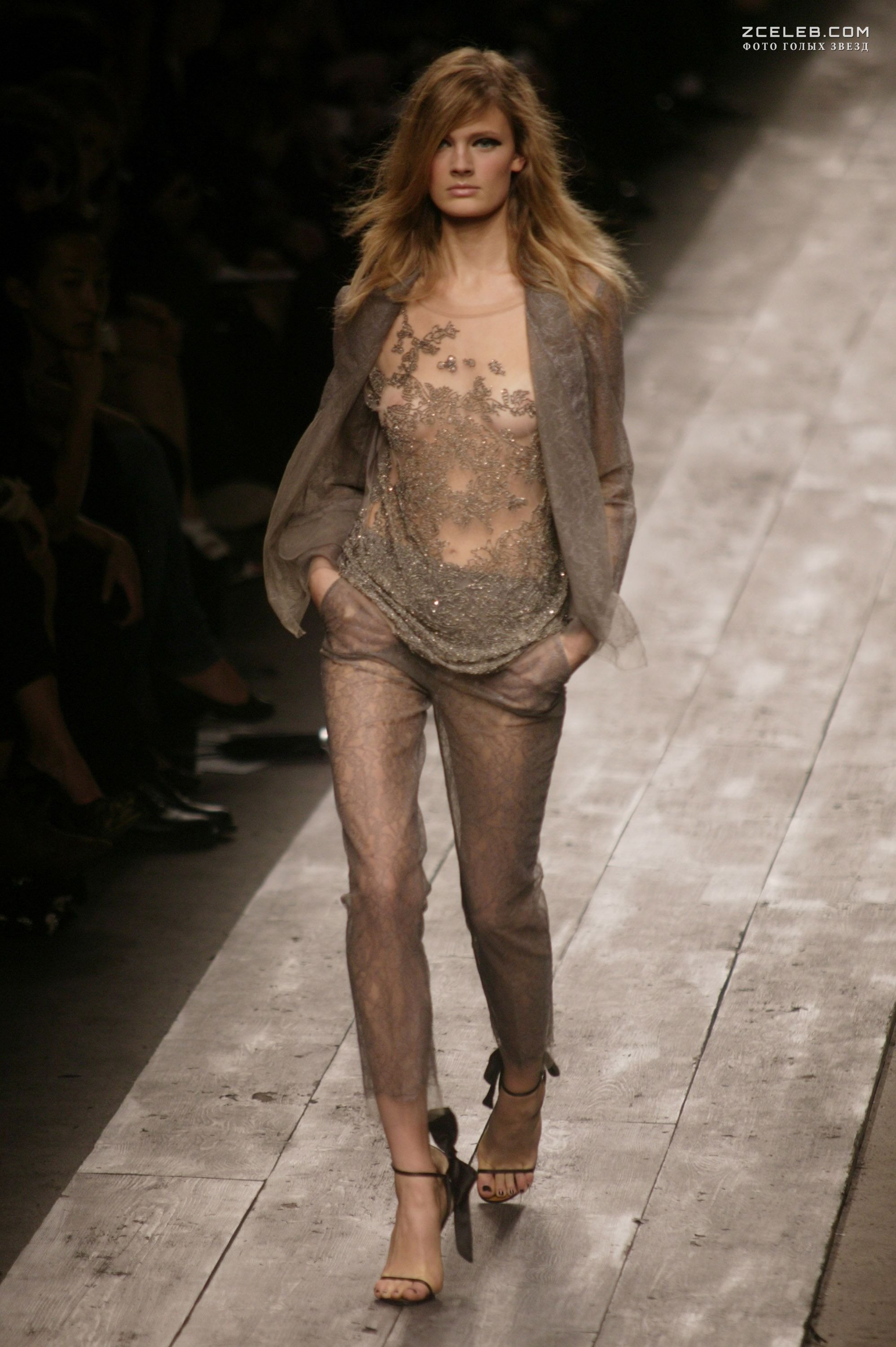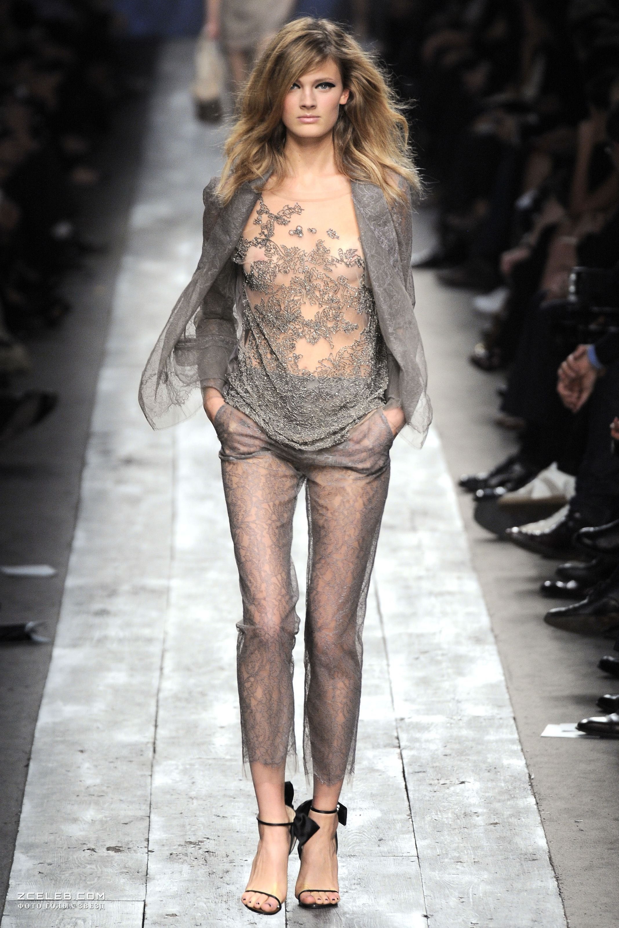 Голая грудь Констанс Яблонски в прозрачном наряде на Balmain Fashion Show