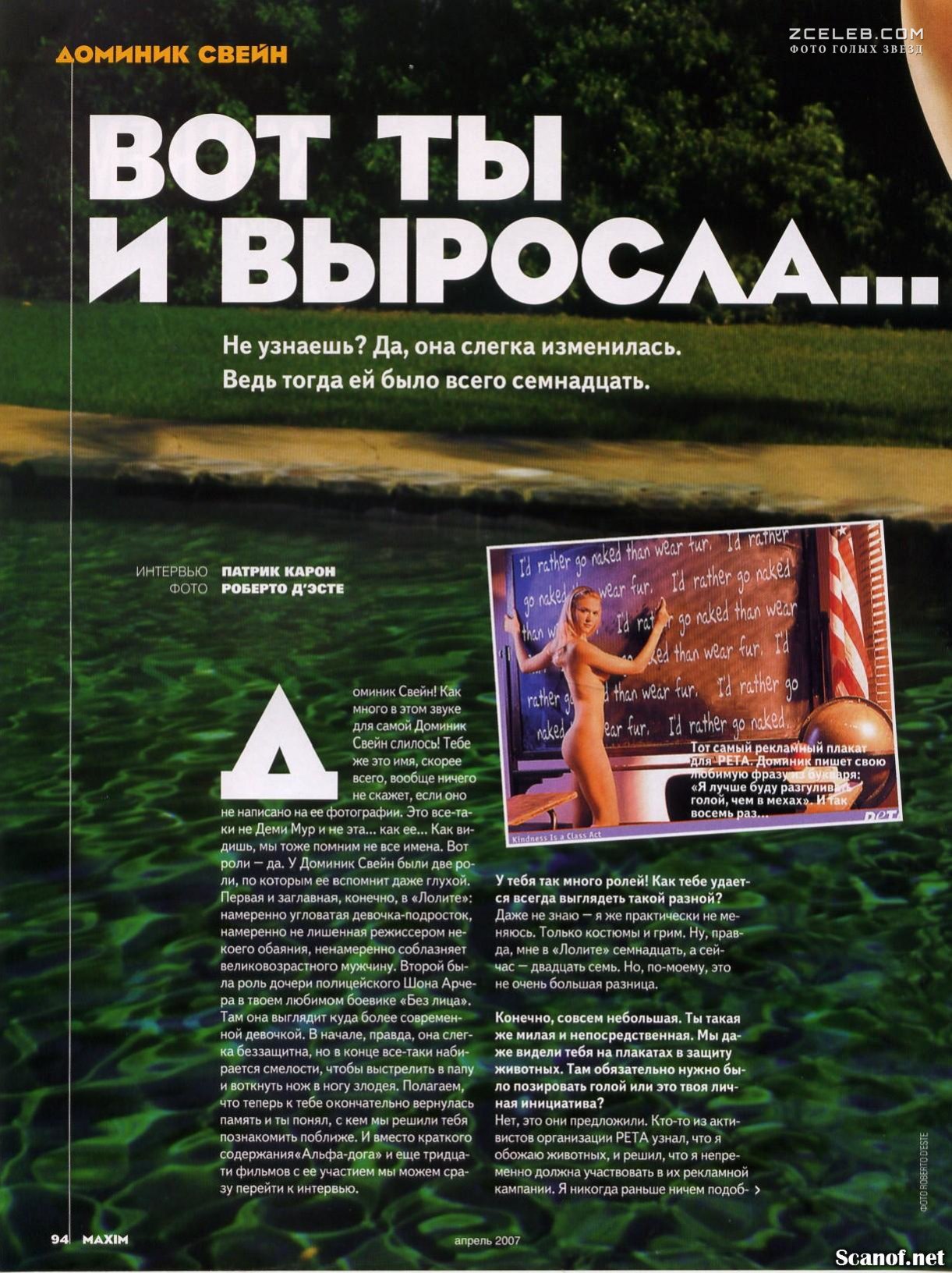 Горячая Доминик Суэйн в бикини снялась для украинского журнала Maxim в апреле 2007 года. Вот Лолита и выросла. И теперь соблазняет нас, поглядывая из глубоких вод.
